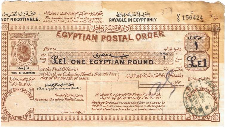 | 61 | 1928 £E1 Sphinx postal order “Payable in Egypt only”, sold at Attarine / Alexandria / (Cash) on 3 XII 28 complete with counterfoil but no payee’s name and not cashed. Wear and staining at top right, but most unusual  | £15.00 |