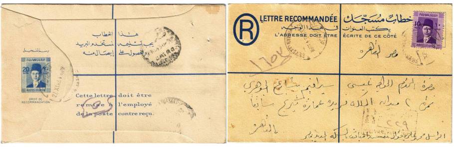 | 81 | 1944, 20m blue Boy King Registered envelope (NP 9) uprated with horiz pair 5m Boy King (on face) and sent from Bab el Luq / Parcels 7 JA 44, to Ataba Khadra (Arabic address). Pinhole, otherwise clean  | £32.00 |