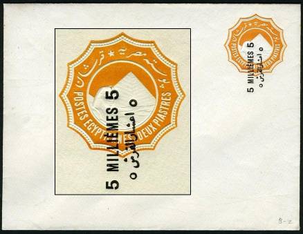 | 34 | 1965, Postage due, hand-painted design in blue and white without value, 104x127mm on heavy card 150x180mm. Adapted for the issued set (SG D852-6, NP PD62-66) with addition of UAR and other amendments by Nabil Hindawy, all annotated on this example. Striking  | £40.00 |