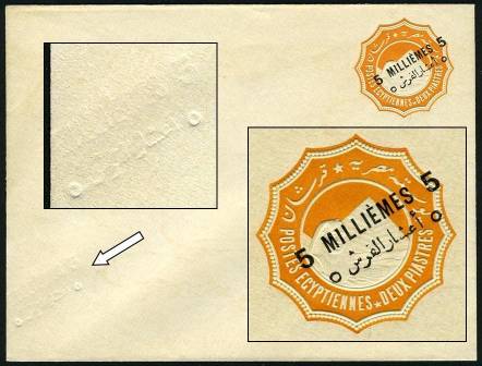 | 666 | 1892 bilingual “5 MILLIÈMES” surcharge in black (24.3mm) on 1888 2pi env (med format, 146x111m, upright wmk), second French “5” and second Arabic “5” transposed. Absolutely pristine, signed “ela”, ex-Mackenzie Low. Very scarce (NP SEN8t)  | £50.00 |