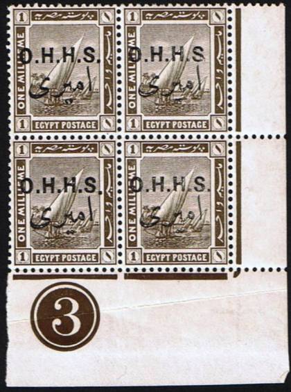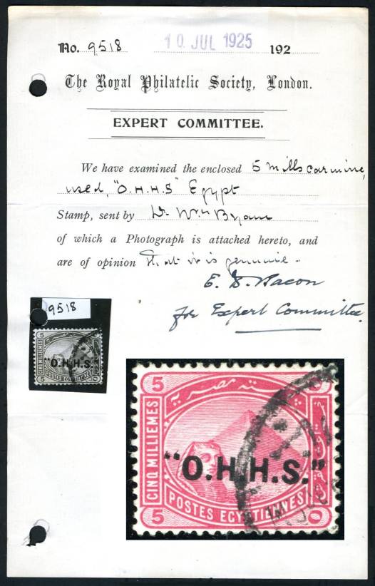 | 682 | 1913 “O.H.H.S.” overprint, the letters “O.H.H.S.” in inverted commas/quotation marks on Fourth Issue 5m. Stunning specimen of Egypt’s rarest Official stamp, of which only about 25 examples are known, all postally used, at Bani Suwef, Mina el Qamh, Alexandria, Tanta, Sohag & Port Tawfiq. This example is among the few known from the Mina el Qamh correspondence. Neatly cancelled by a 30+% strike of CDS showing Arabic “MINA A…” and partial dateline, it is from one the varietal positions on the 60-subject pane, its left-hand inverted commas missing most of their tails, appearing more like square stops (NP O8 var.). Signed “ela” (E L Angeloglou), with detailed Hass colour photocert and 1925 RPSL cert. (stamp submitted by Dr Byam). Great treasure among Egypt’s Official stamps  | £450.00 |