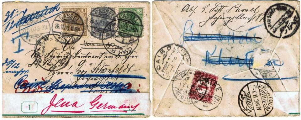 | 23 | 1903-04, astonishing well-travelled cover, Germany-Egypt-Sudan-Egypt-Germany with ten CDS, sent from Cassel 26 11 03 to Jena, redirected to Shepheards and attracting a 4m Due on arrival in Cairo. Redirected to Bario(?) Hotel, Khartoum, then back to Shepheards, and finally, via Egyptian 2m DLR stamp edging in red ink, back to Jena. Three strikes HS5, much annotated, fascinating | £48.00 |