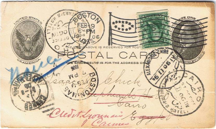 | 24 | 1906, US 1c postal stationery card uprated with 1c stamp and sent from Boston (clear “flag” machine cancel) to Shepheard’s via Alex-Cai TPO. HS5 Shepheard’s 25 II 06 TIV twice, once incoming, once outgoing as readdressed to Cannes, where it arrived March 9. Neat and colourful  | £20.00 |