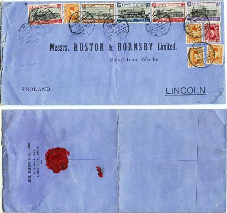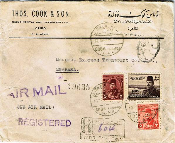 | 27 | 1950, Thos Cook printed envelope, franked 107 mills (inc Farouk 100m) to Mombasa, red T.C / Co / Cairo wax seal behind, three strikes of HTC10 of 10 MA 50 (latest recorded) and Reg box. Fine shape  | £38.00 |