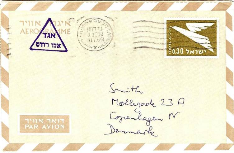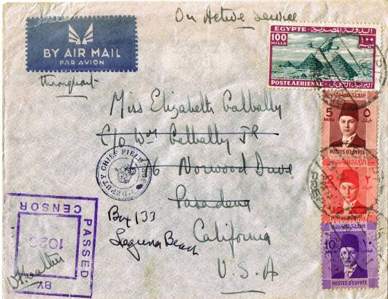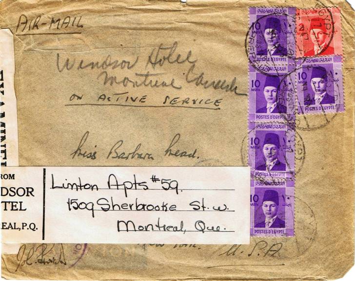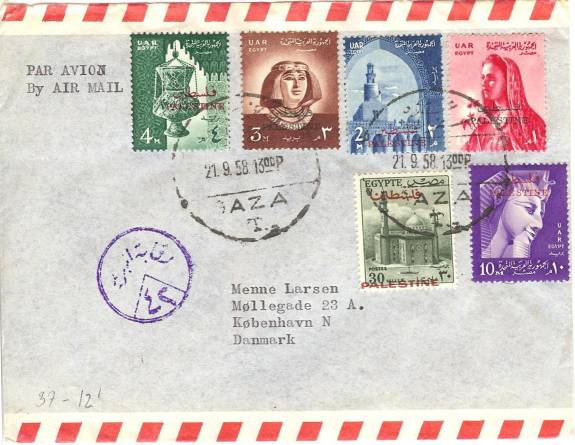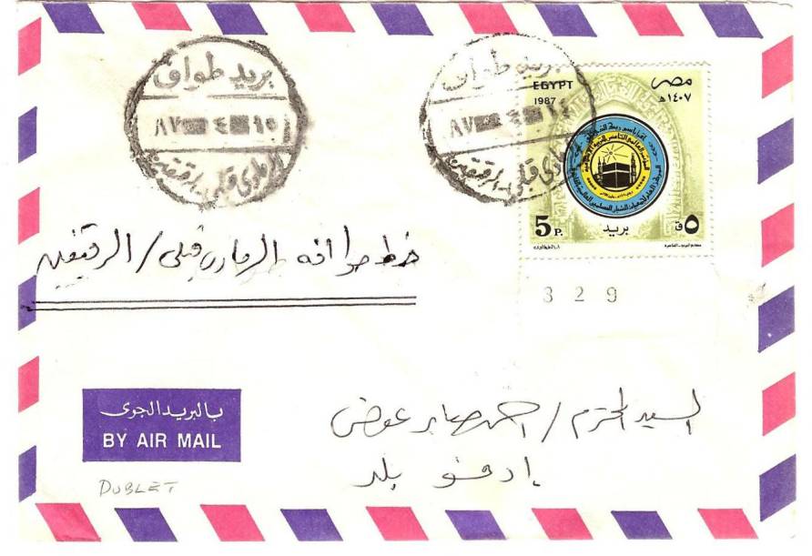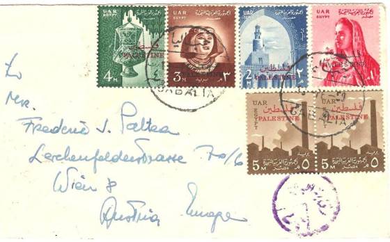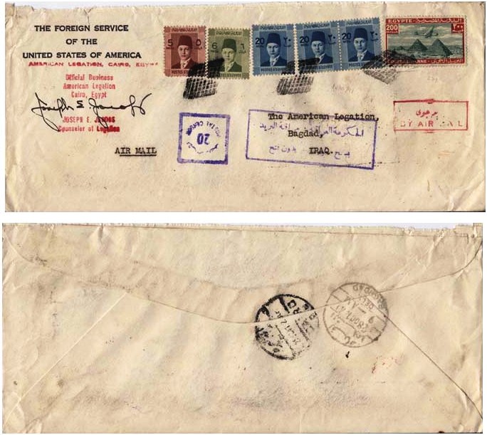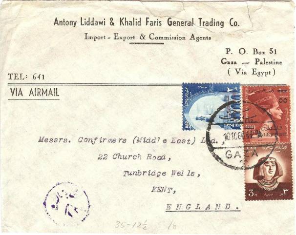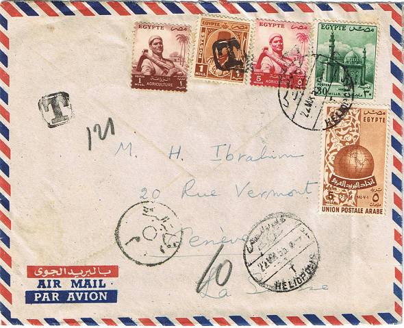 | 33 | 1955, Air cover from T/ Heliopolis 22 MA 55, franked 42 mills but including unbarred Farouk Marechal 1 mill stamp – this cancelled with boxed T, another alongside, and pencilled 10 (on arrival?). Not accepted because simply out of date, or does the T deface Farouk? Letter survives  | £20.00 |