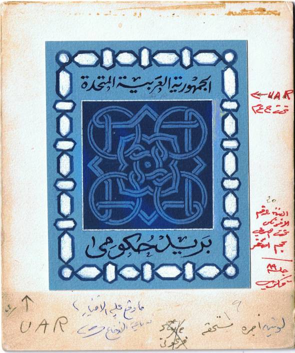 | 34 | 1965, Postage due, hand-painted design in blue and white without value, 104x127mm on heavy card 150x180mm. Adapted for the issued set (SG D852-6, NP PD62-66) with addition of UAR and other amendments by Nabil Hindawy, all annotated on this example. Striking  | £40.00 |