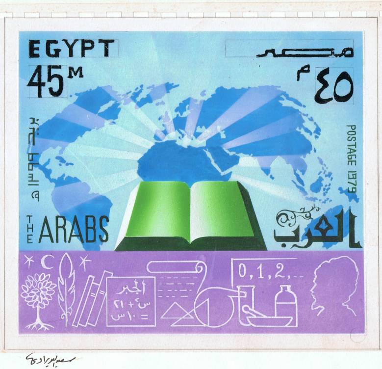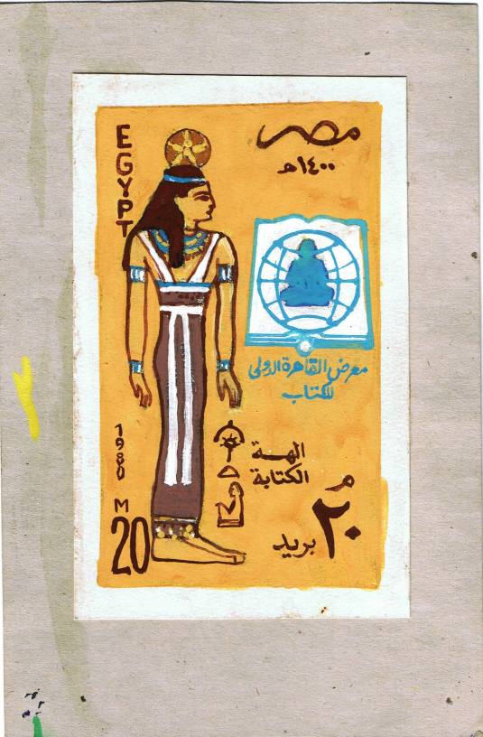 | 37 | 1980, 20m Cairo Book Fair, adopted hand-painted design by Ibrahim el Tahtawi at 8.6x15cm on rough thick card 15x23cm. Issued as SG 1410, NP C874  | £30.00 |