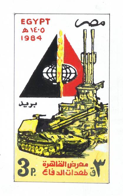 | 39 | 1984, 3p Exhibition of Egyptian Defence Equipment, adopted hand-painted design by Y Abdel-Hamid at 9x16cm on thick card (14x21.5cm). Issued as SG 1559, NP C1018)  | £30.00 |