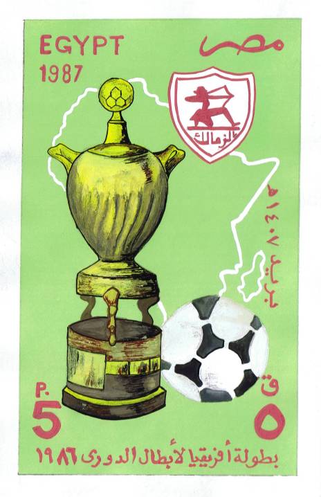| 43 | 1987, Zamalek Football Champions, adopted hand-painted design by Ibrahim el Tahtawi at 11.3x18.5cm on thick paper 13.3x20.5cm. Issued stamp is SG 1657, NP C1089  | £30.00 |