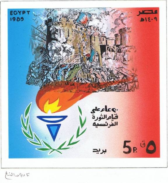 | 44 | 1987, 5p Helwan University Anniversary, unadopted hand-painted design by Ibrahim el Tahtawi at 18x11cm on thin card 24.5x17.5cm. Eventually another stamp issued in 2001! | £30.00 |
