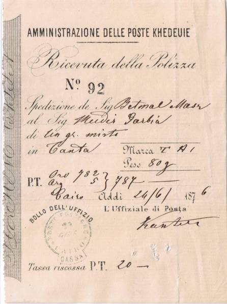 | 55 | 1877? Amministrazione delle Poste Khedivie Egiziane, Italian-language “penalty for stock values” (form No 20) receipt 175x131mm cancelled with very faint Cassa CDS. Text suggests handled at Magagha. No wmk, single fold, perfectly clean | £15.00 |
