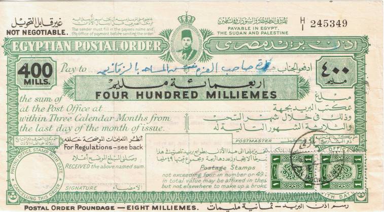 | 62 | 1948 400 mills Farouk postal order “Payable in Egypt, the Sudan and Palestine” apparently sold at El Malika Nazli in 1953(?) and provided with 2x1m General Revenues, but never cashed. Neat, clean  | £18.00 |