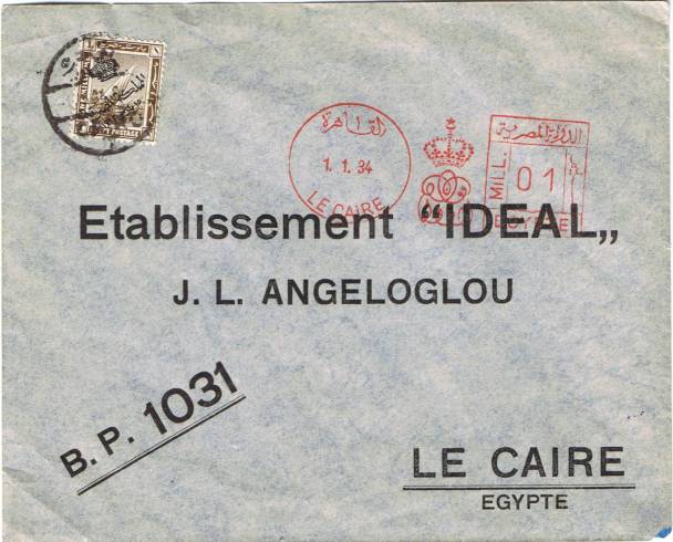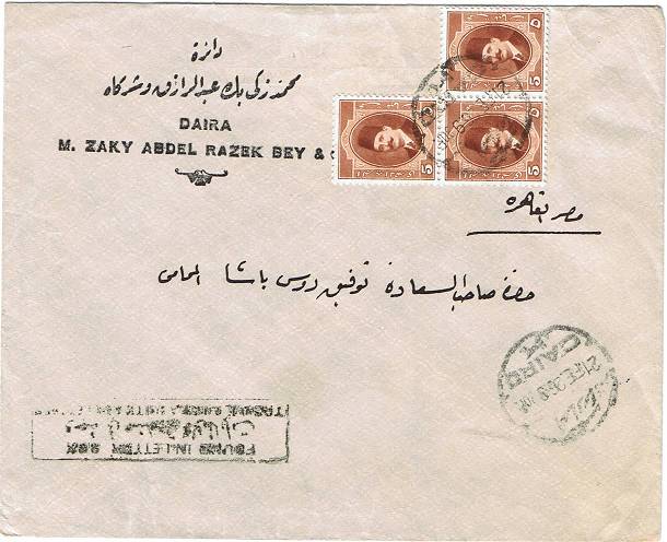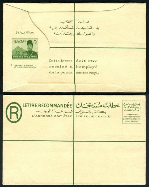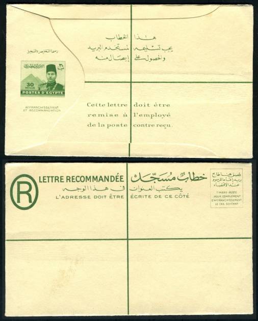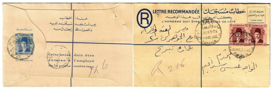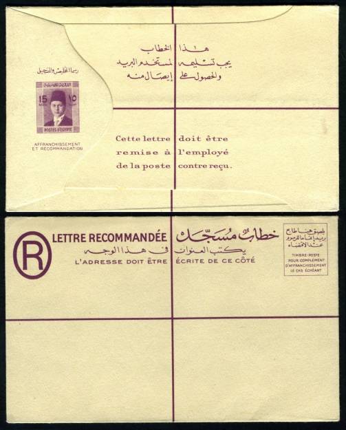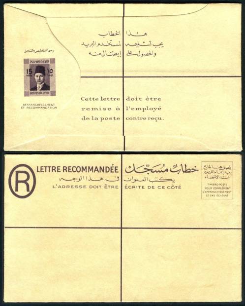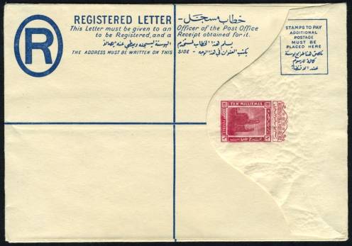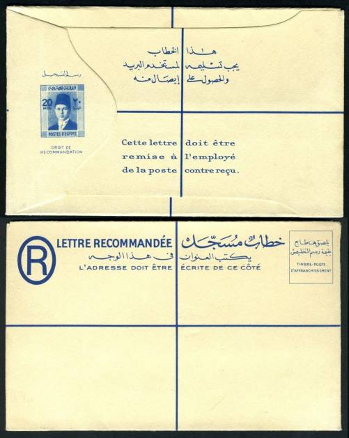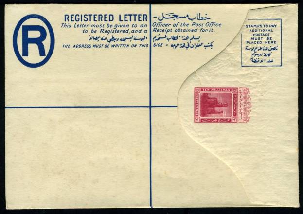 | 81 | 1944, 20m blue Boy King Registered envelope (NP 9) uprated with horiz pair 5m Boy King (on face) and sent from Bab el Luq / Parcels 7 JA 44, to Ataba Khadra (Arabic address). Pinhole, otherwise clean  | £32.00 |