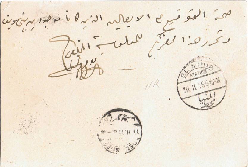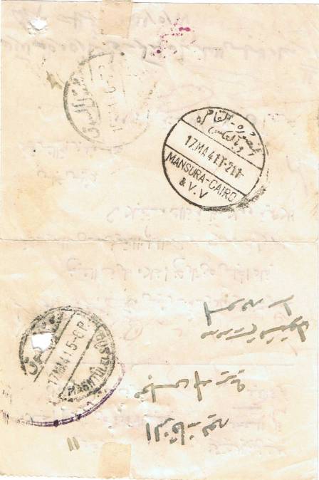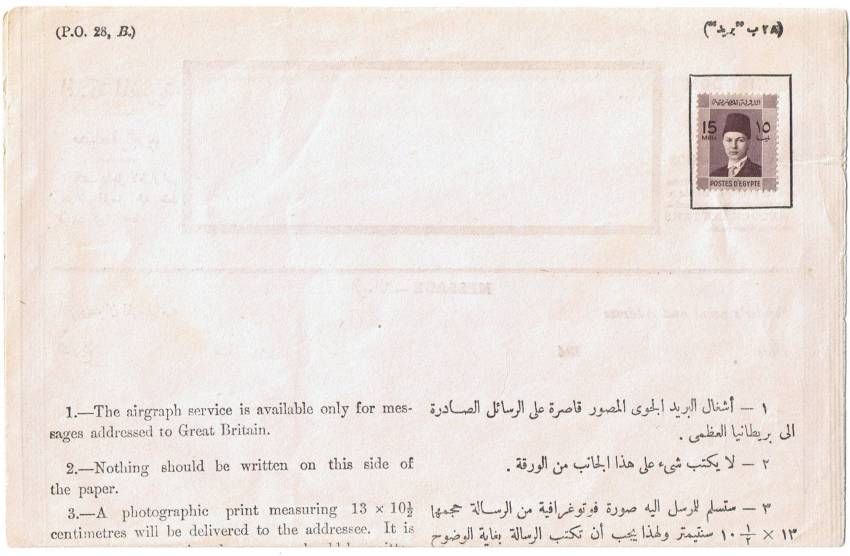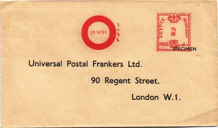 | 30 | 1949, small cover Arabic-addressed to Military Hospital in Qubba Bridge from Ismailia / P 17 AP 49, unfranked but with triangular internal service cachet 213 in place of stamp, with Arabic notation alongside. Together with Fouad Red Crescent Hospital ID pass (1949) in pristine condition. Unusual | £7.00 |