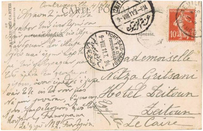 | 22 | 1899, Good strike (80%) of elusive Shepheard’s Type 4 CDS on clean postcard (Caire – Un Anier) with pencil message addressed to Paris. 4(?) I 99 – recorded for only two months  | £28.00 |