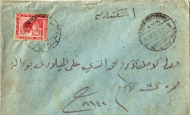 | 78 | 1922 Arabic-addressed cover Zifta 18 MR 22 to Cairo franked with Harrison 5 mills pink Sphinx (SG 90) from booklet (guillotined at bottom). Clean cover, CDS 65%, some sun staining | £18.00 |