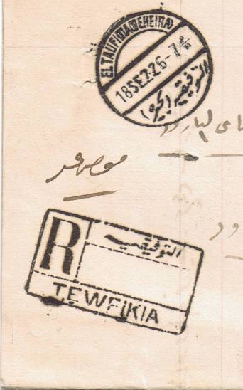 | 58 | 1906, PO receipt for a registered item, completed by hand and cancelled with good strike of elusive Birket el Sab star and crescent CDs of 27 NO 06 TIV | £20.00 |