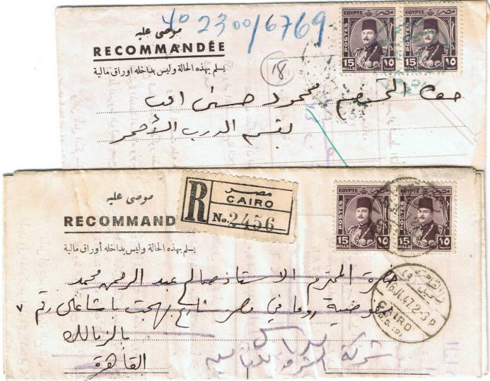 | 80 | 1941-43, Boy King 3m visiting-card envelopes (NP SEN 34), two printings in pale and dark shades, one from Fayum, other from Asyut readdressed to Governor of Alexandria Prison. Contents remain | £12.00 |