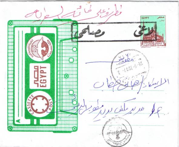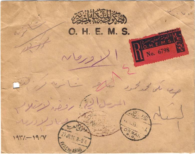 | 32 | 11 NO 40, Survey and Mines Department map-tube wrapper (red on buff), folded because of shortage of tubes(!) and sent from Orman to Aswan, “franked” by illegible Official oval and large red-on-white Orman Registration label. Unusual, folded to 24.5x15cm | £5.00 |