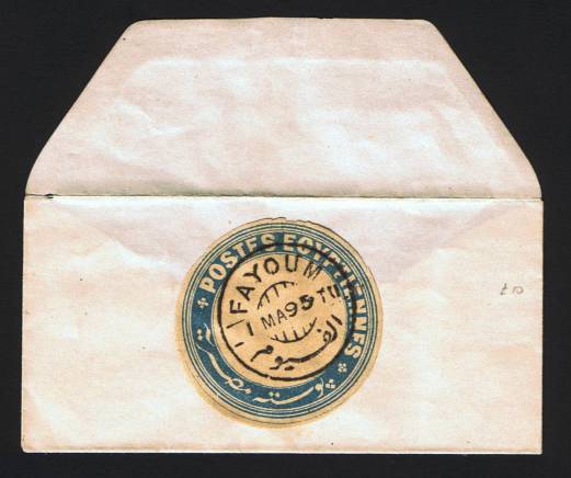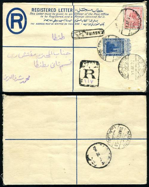 | 639 | 1914 DLR Colossi 10m blue, the scarce second envelope, with English and Arabic inscriptions. Used to Tanta via Rural Service, fresh and fully sound, clean as can be! Via Minuf, with boxed SINGUIRG village cartouche, boxed R, uprated with 5m pink, vignette cancelled by three strikes Rural Service / Menuf-Miniet el Wat / 11.AP.22, clear Minuf and unclear Tanta backstamps. Most unusual usage. (NP SRE2)  | £95.00 |