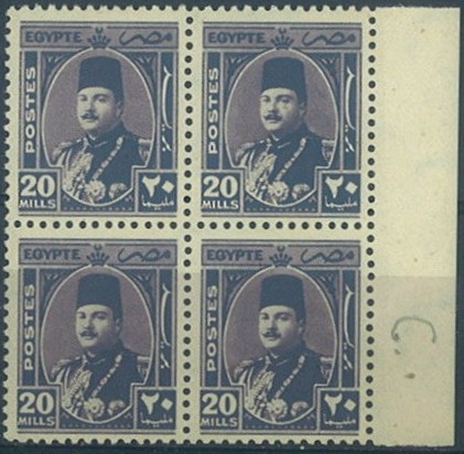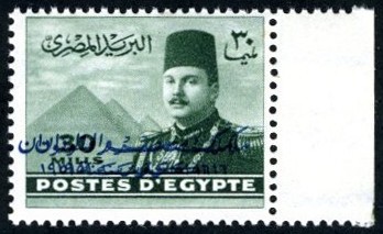 | 676 | 1952 Farouk Maréchal 30m green, error, double overprint of “King of Egypt and Sudan”, super-fresh, NH, with right-hand sheet margin. Only 100 mint examples were found. (NP D185c). With detailed Hass colour photocert  | £55.00 |