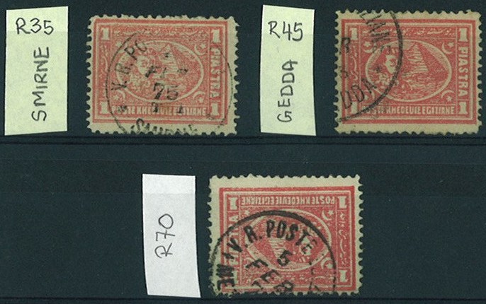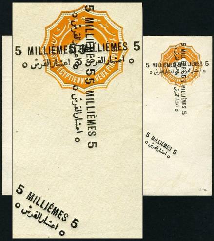 | 622 | Six stamps. Three perforated – 5 para (inverted wmk), 10para (upright wmk 1b), 20 para (upright wmk 1b); and three imperforate proofs – 10 para (upright wmk, scarce), 2 piastres (no wmk), 10 piastres (no wmk). All in mint condition with light hinge. Cat over £700  | £130.00 |