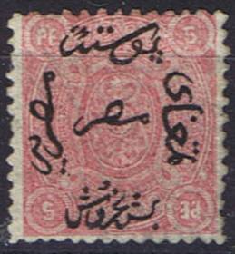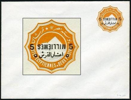 | 666 | 1892 bilingual “5 MILLIÈMES” surcharge in black (24.3mm) on 1888 2pi env (med format, 146x111m, upright wmk), second French “5” and second Arabic “5” transposed. Absolutely pristine, signed “ela”, ex-Mackenzie Low. Very scarce (NP SEN8t)  | £50.00 |