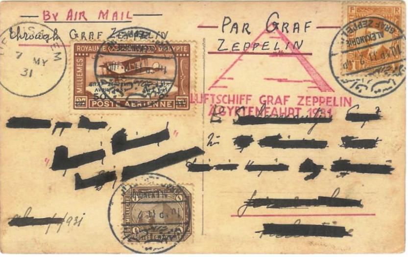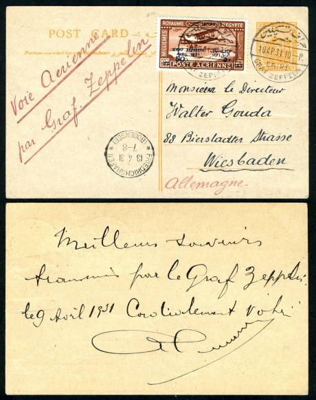 | 683 | 1931, scarce 3m orange Harrison card (NP SPC30) with 50m surcharge of GRAF ZEPPELIN / AVRIL 1931 stamp (NP C36, posn 12) for postcard rate on Zeppelin flight. Beautifully fresh & perfect, addressed to Wiesbaden, inscribed on face in red, “Voie Aerienne / par Graf Zeppelin”, with message on reverse, “Meilleurs Souvenirs / français(?) Par le Graf Zeppelin / le 9 Avril 1931. Cordialement Votre, etc.”. Stamp & 3m vignette tied by perfect strikes CAIRE / GRAF ZEPPELIN / 10.AP.31. 10.—P., with lovely CDS FRIEDRICHSHAFEN * (BODENSEE) * / 13 4 31 / 7— 8. Beautiful & rare Zeppelin item  | £160.00 |