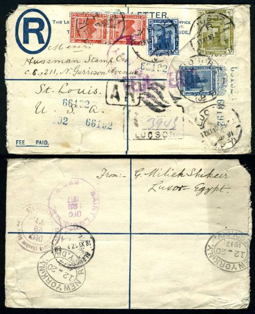 | 638 | 1914 DLR Colossi 10m blue, the exceedingly scarce first envelope, with English inscriptions only, used quadruple-weight to US from LUQSOR / R / 17.XI.17, with AR (Avis de Réception) service! Uprated on face with 38m in 1914 stamps (4m pair, 10m, 20m) for 48m rate (10m reg, 10m AR, 10m letter rate, 3 x 6m added weight bands). 19 postmarks and auxiliary markings (inc censor, LUQSOR reg. cachet, boxed AR). Fragment of green 4m selvage at top shows how AR form was affixed. A bit stressed due to heavy contents, fully sound but for insignificant rounding of NW corner. Possibly unique, certainly of significant rarity! (NP SRE1)  | £165.00 |
