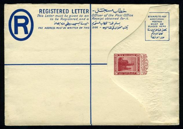 | 82 | 1944, 20m blue Boy King Registered envelope (NP 9) uprated with 10m Boy King (on face) and sent from Hilwan les Bains 27 XI 48, faint Reg box alongside Arabic address, to Cairo. Sl sun staining but very clean  | £32.00 |