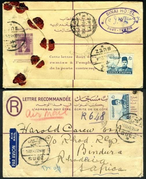 | 644 | As last, 15m red-violet, magnificent postally used, airmail to Southern Rhodesia from Suez (10 DEC 45), 100m added franking (2x50m Boy King, 1 on face, 1 on reverse), total of 115m. Key aspect of wonderful cover is clear strike of purple double-oval SINAI HOTEL * PORT-TEWFIK * (signed by sender). Six wax seals (still present) closed flap, which was gently opened. Outstanding condition, a most unusual hotel gem! (NP SRE8)  | £95.00 |