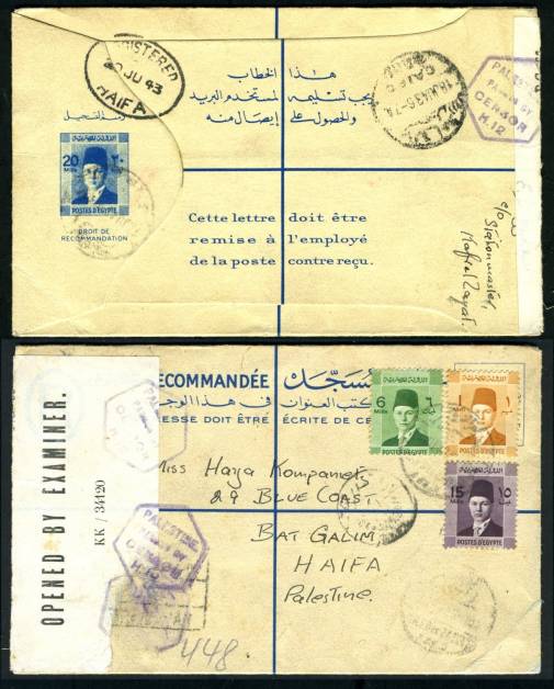 | 646 | As last, 20m blue, lovely postally used, surface mail to Palestine from Cairo (18 JU 43), 22m added franking (Boy King 1m, 6m, 15m, on reverse), total 42m (20m Reg + 22m foreign letter rate). Opened and resealed by Palestine censor (cream tape OPENED BY EXAMINER / KK / 34120 / PC. 90”, with 4 purple strikes hexagonal PALESTINE / PASSED BY / CENSOR / H.12, etc. Paper adhesion (tied by trilingual boxed marking) indicates where reg card was attached. Outstanding condition, a stunning WWII postal history item (NP SRE9)  | £75.00 |