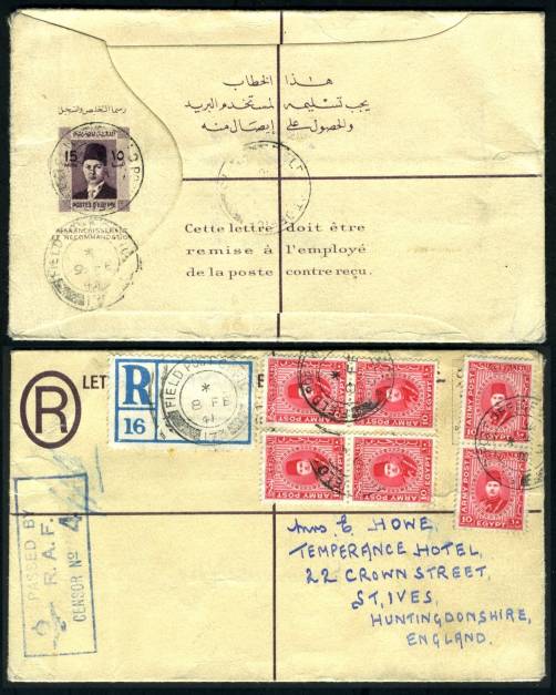 | 648 | As last, 15m red-violet, lovely used example, VF and clean, British military usage, sent to England (8 FE 41) via Field Post Office. Six added 10m Farouk Army Post adhesives on reverse, with R / 16 military reg. label, cancelled FIELD POST OFFICE / 173 / * / 8 FE 41. Civil envelope vignette cancelled same marking, but next day (9 FE) and at office 173. Blue, boxed, winged-crown PASSED BY / R.A.F. / CENSOR No. 4A. Very scarce usage (NP SRE10)  | £150.00 |