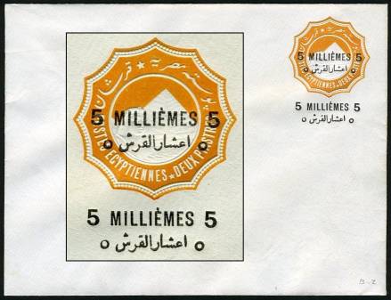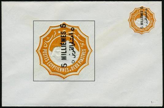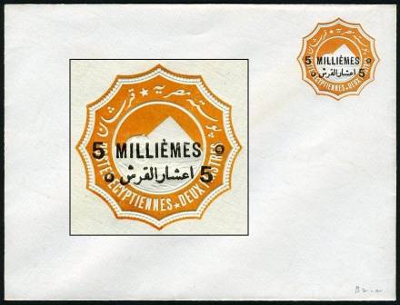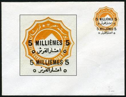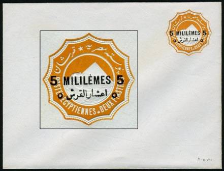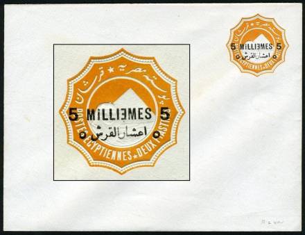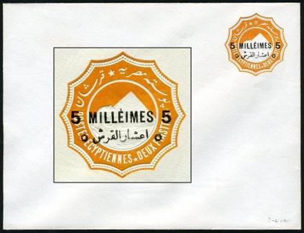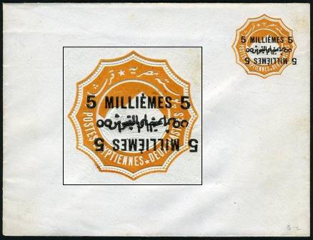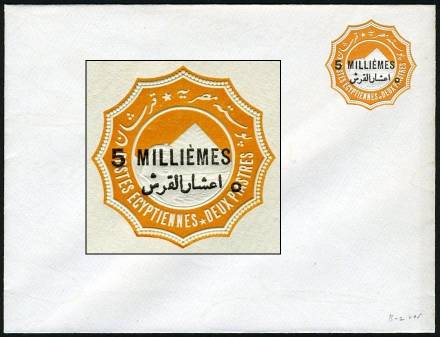 | 675 | 1891-1892 essay for 1892 bilingual “5 MILLIÈMES” surcharge in black on 1888 2pi env (small format, 146x111mm, inv wmk). As listed in NP (page 19), this is sub-listing of E125, “(Similar to) SEN9 (with “hamza” atop “alef”), with a first essay surcharge slightly longer than the issued surcharge, applied on the vignette, rotated 30º counterclockwise, with a second, larger essay surcharge applied towards the bottom-left edge of the envelope … partly missing, since it was struck across the edge …”. This example, in absolutely pristine condition (ex-Mackenzie Low), is NP E125a, “with the second surcharge albino”. Very rare essay envelope, probably unique.  | £150.00 |