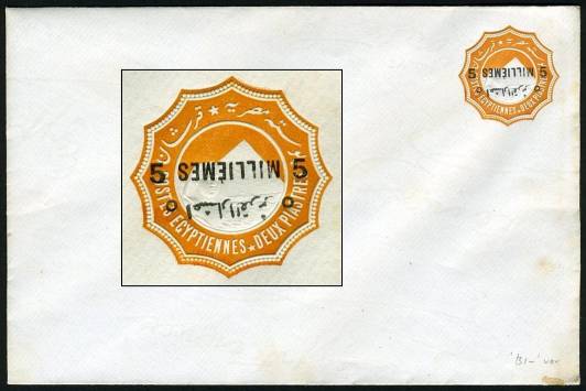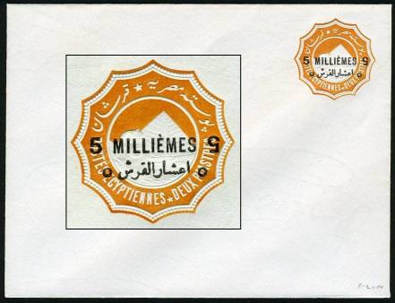 | 661 | 1892 bilingual “5 MILLIÈMES” surcharge in black (24.3mm) on 1888 2pi env (med format, 146x111mm, inv wmk), French word “Millièmes” inverted. Absolutely pristine, signed “ela”, ex-Mackenzie Low. Very scarce (NP SEN8n)