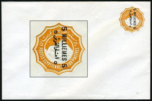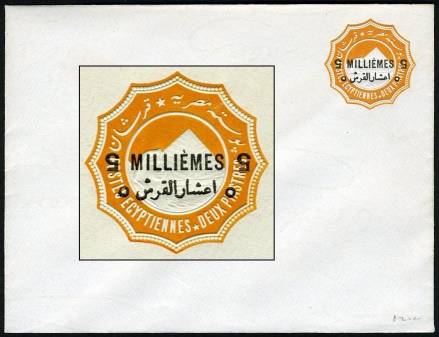 | 674 | 1892 bilingual “5 MILLIÈMES” surcharge in black on 1888 2pi env (med format, 146x111mm, upright wmk), surcharge doubled, combined types (24.5mm and 23mm wide). Absolutely pristine. The 24.5mm surcharge is with “hamza” removed, as on NP SEN9c, while the 23mm surcharge (printed beneath the former) shows characteristic nick in inside curve of the second “5”, as on NP SEN7. Incorrectly listed (as SEN8x) in NP, this should actually be SEN9d. All other such “combination doubles” seen by C. F. Hass in 40 years are forgeries (all with an added, forged, 23mm surcharge). But this example is absolutely genuine, and possibly unique. An important rarity.  | £85.00 |