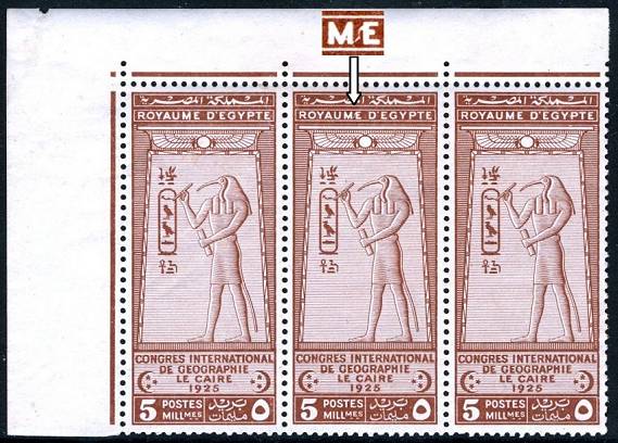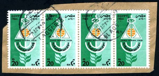 | 680 | 1980 20m brown, grn-blue & orange 13th Cairo International Fair, horiz strip of four used on piece (cancelled EL AQSOR), right stamp being the error, missing Arabic inscription at SE corner (an error of cylinder staging). Very fine and fully sound, signed C F Hass (NP C876a)  | £28.00 |