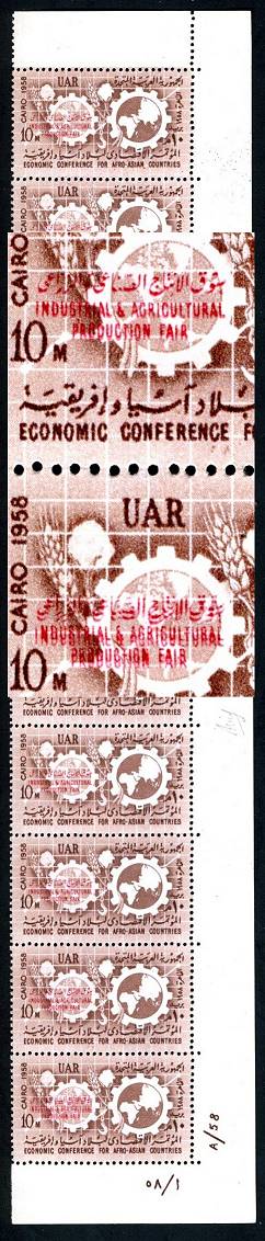| 679 | 1958 10m red-brown with Industrial & Agricultural Production Fair overprint, the error of double overprint, pristine, unmounted mint vertical strip of ten from the right edge of the pane (with control number), vividly showing complete doubling on bottom stamp, the stamp above partly doubled (NP C210a). Detailed Hass colour photocert  | £55.00 |