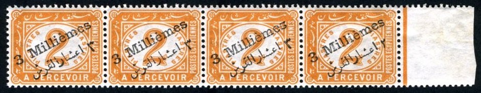 | 681 | 1898 2pi deep orange postage due with bilingual 3 Millièmes surcharge, right marginal, horizontal strip of four stamps, its RH stamp showing the error, Arabic “2” in place of “3”. VF UMM, hinged in selvage only. (NP PD19a). Signed C F Hass  | £25.00 |