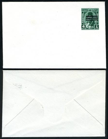 | 685 | 1953, 4 mills deep green Farouk carte de visite envelope with portrait obliterated by 3 bars, 90º screen (NP SEN41b). Rare as genuine, as most examples in circulation are forgeries, but this is the real thing. Hass colour photocertificate  | £65.00 |