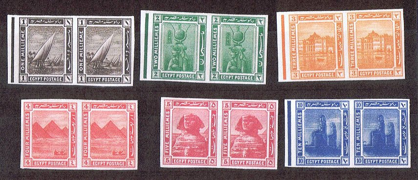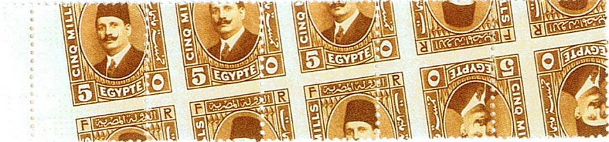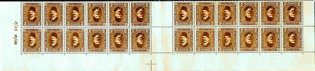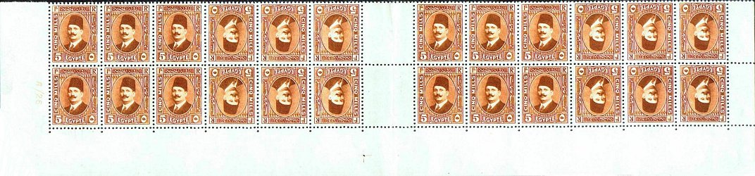 | 738 | 1927 Second Fuad. Set of five marginal horizontal 5m dark red-brown tête-bêche with oblique perforation and inverted wmk. Pristine condition (Bal D112). Very scarce  | £90.00 |