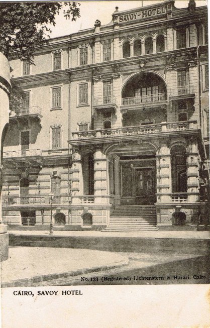 | 82 | 1905, upright b-w unusual postcard of Savoy Hotel front entrance (Lichtenstein/Harari), excellent condition, used with 2m DLR from Boulaq.Cairo 9 VIII 05 via Cairo to Ciney, Belgium. Good markings  | £4.50 |
