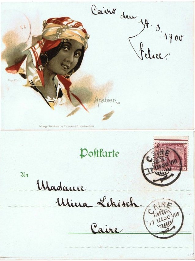 | 85 | 1900, absolutely gorgeous series of five Morgenlandische Frauenschönheiten “beauties” colour cards (portraits of girls from Arabien, Indo-China, Armenien, Persien and Tatarei), all addressed from son to mother on the same day, all with Caire / bars 17 II 00 VIII CDS, and all properly franked with DLR 3m maroon (with upper Jubilee line) for en ville rate. One card Felice Lekisch practises his Arabic signature. Fascinating and beautiful, excellent condition  | £15.00 |