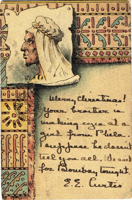 | 87 | 1903, coloured card, fine condition, with amusing message including “we sail for Bombay tonight”, franked 2x2m DLR (one damaged) cancelled Port Said. Good Cincinnati / Station E machine arrival Dec 18 1903  | £4.00 |