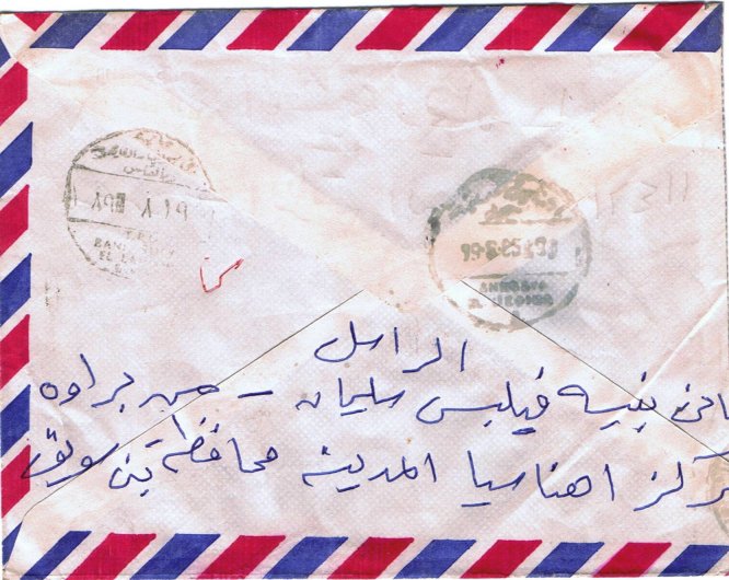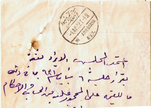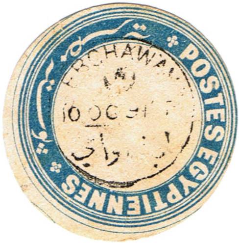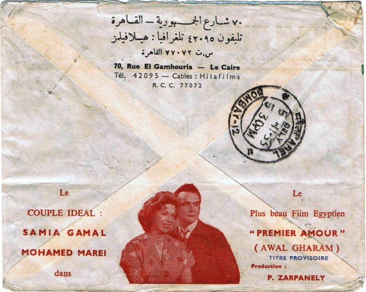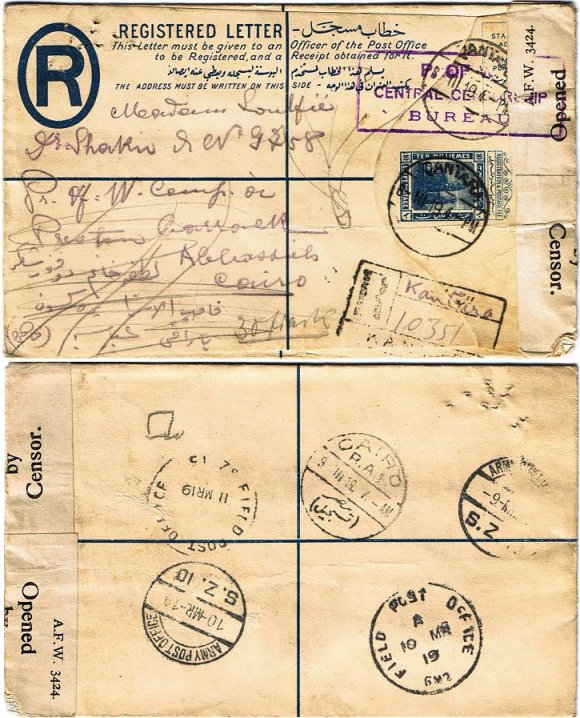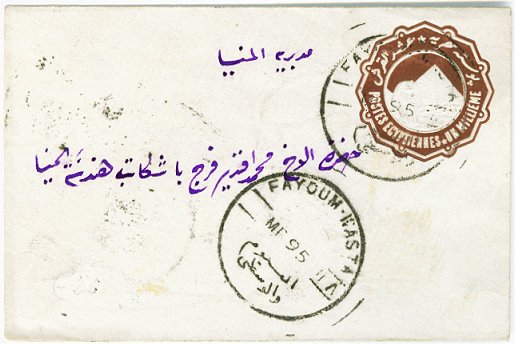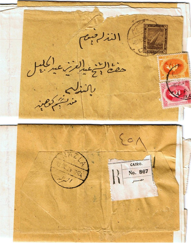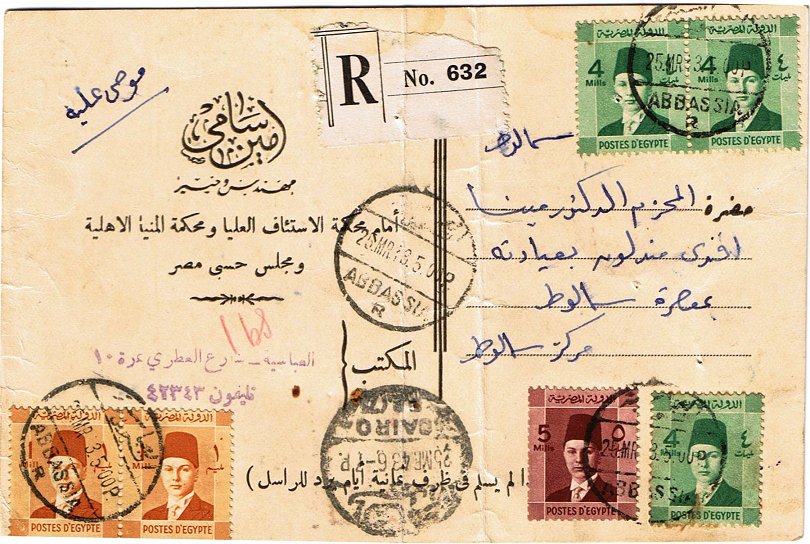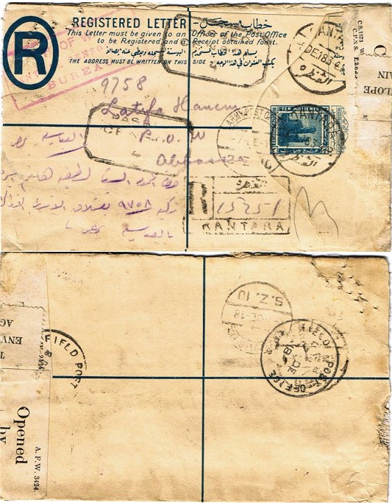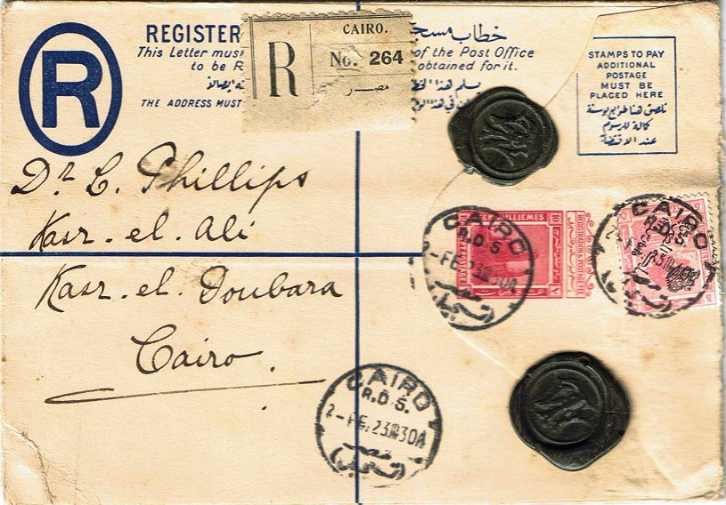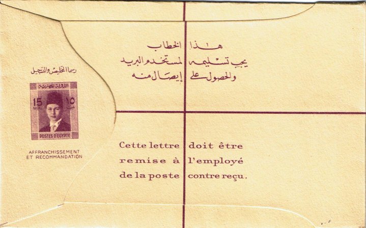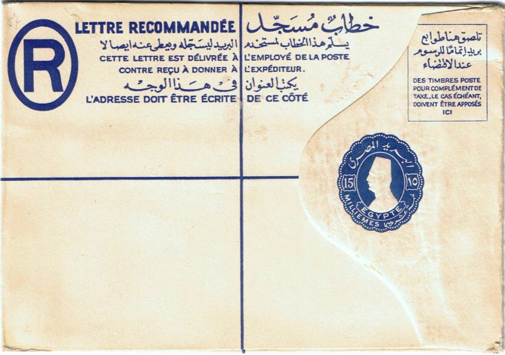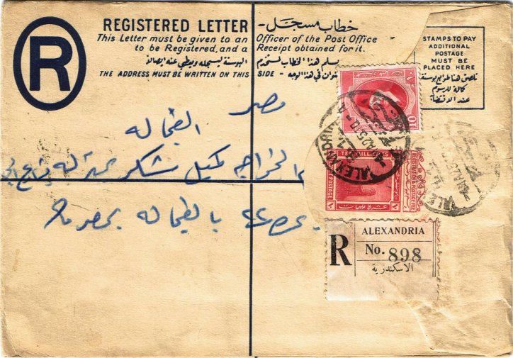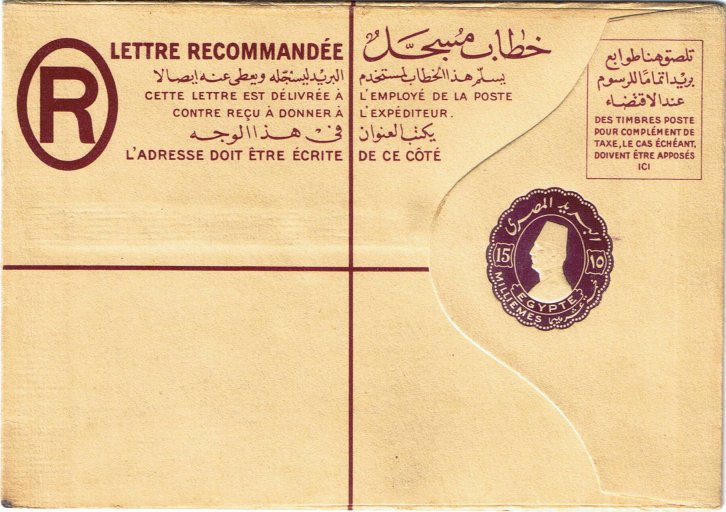 | 53 | 15 mills navy blue registered env used with 10 mills red. Exceptionally clear postmark (El Malaka Nazli) | £22.00 |