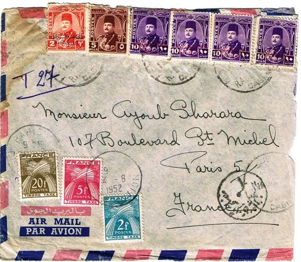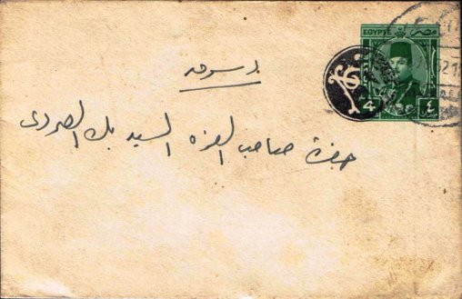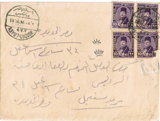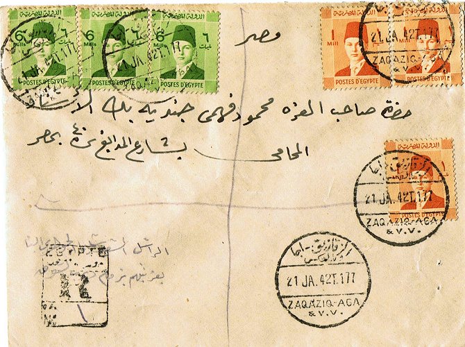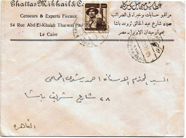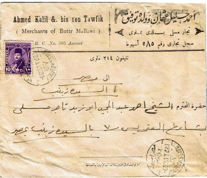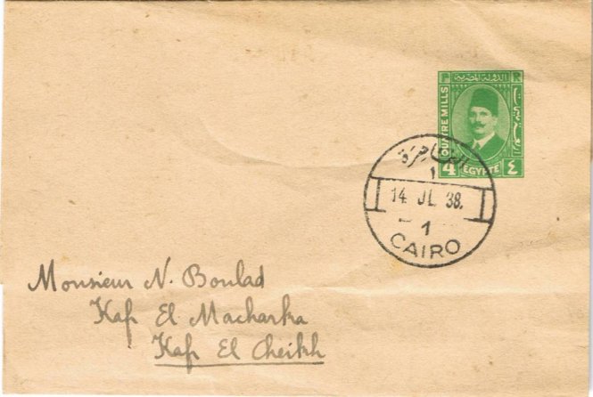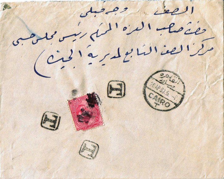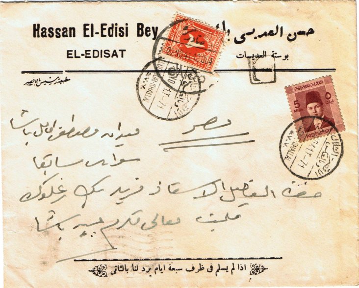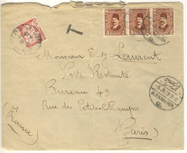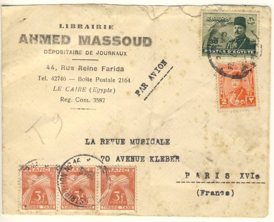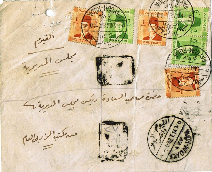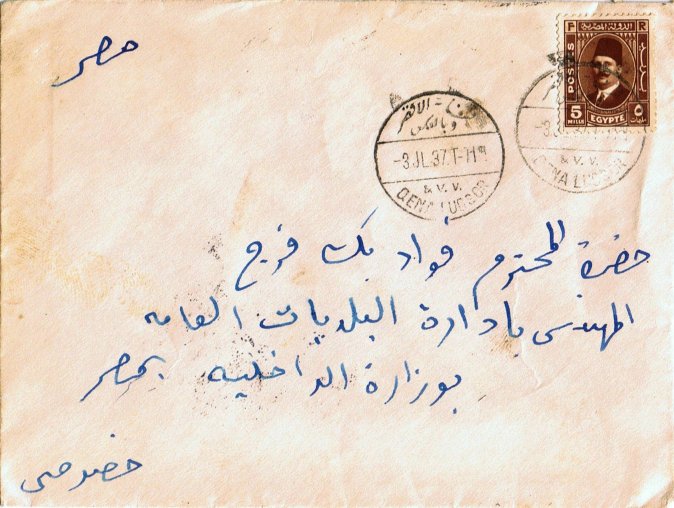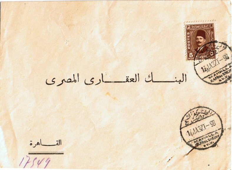 | 727 | 3 II 27 Rural Service cover Samalut-Daquf to France with 3x Fuad First set 5 mills, cartouche Qutusha. Untidy back. | £3.00 |
