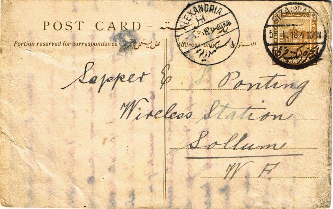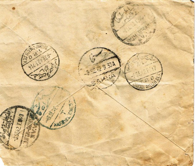 | 731 | 1918 philatelic looking cover addressed to Lieut Roper at Sidi Bishr with SG 73-76 and SG78 separately cancelled with Alex-Abuqir cancels. Bit tatty | £1.00 |