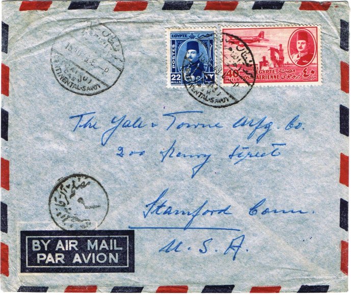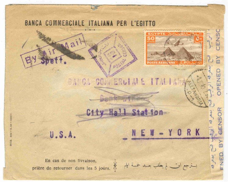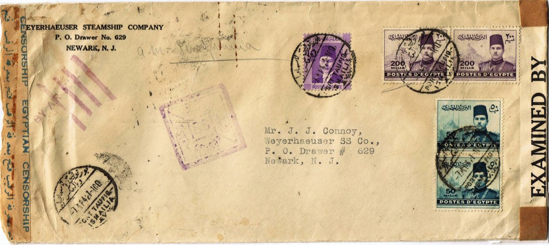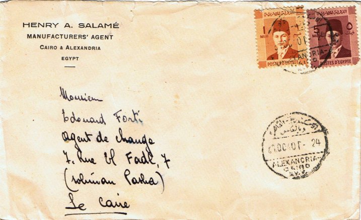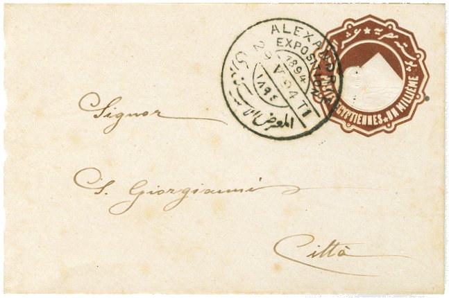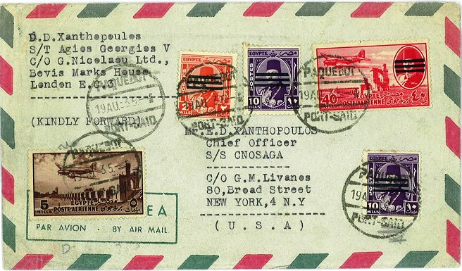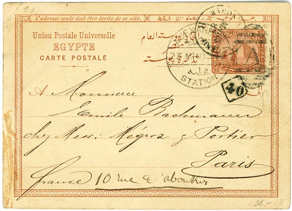 | 78 | 195 mills (100 + 50 + 2 x 20 + 5 mills), registered postal card Alexandria to New Jersey | £29.00 |