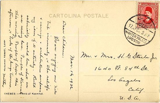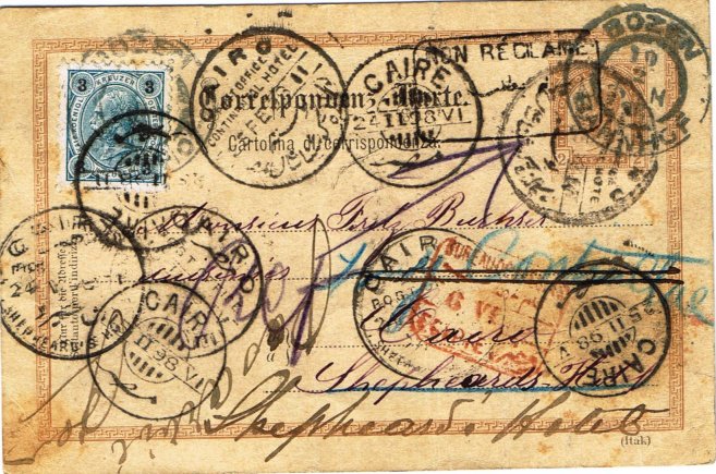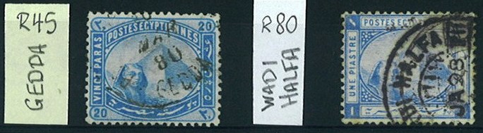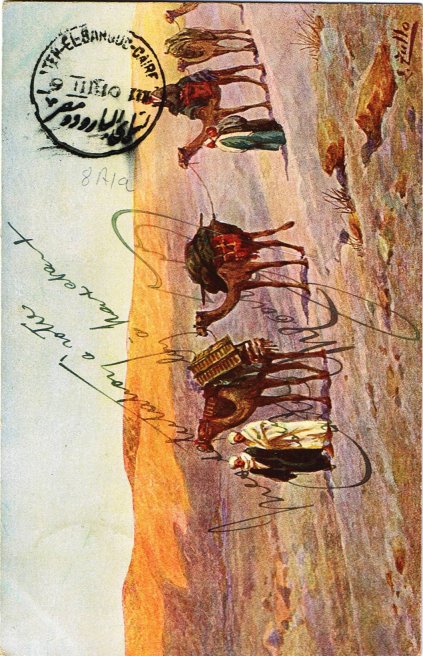 | 84 | 1891, somewhat battered b-w card of Kalabsha Temple (before it was moved!), with message “am now at the second cataract of the Nile, 1000 miles from Alexandria”. Franked 4m Sudan Camel Postman with illegible CDS and Travelling Post / Shellal- / Halfa 25 II 91 alongside. Faint Syracuse (NY) arrival | £4.00 |