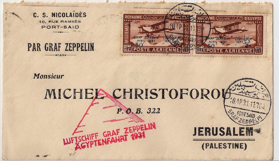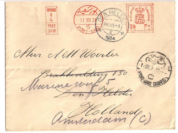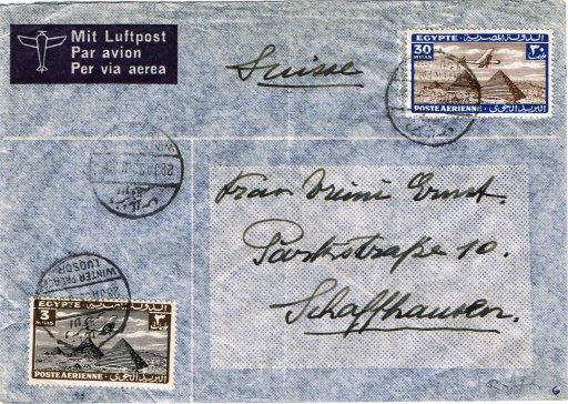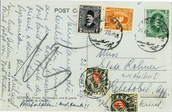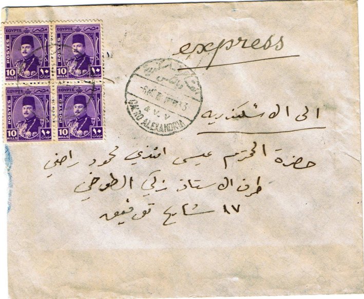 | 71 | 45 mills (4 x 10 mills + 4 mills + 1 mill) Air Mail for part of journey. Left Egypt 11 Aug 1933, arrived Germany 13 Aug, Groningen 14 Aug. The journey from Berlin to Groningen would be by rail. Clean cover includes “Par Avion Jusqu’a Allemagne” | £49.00 |